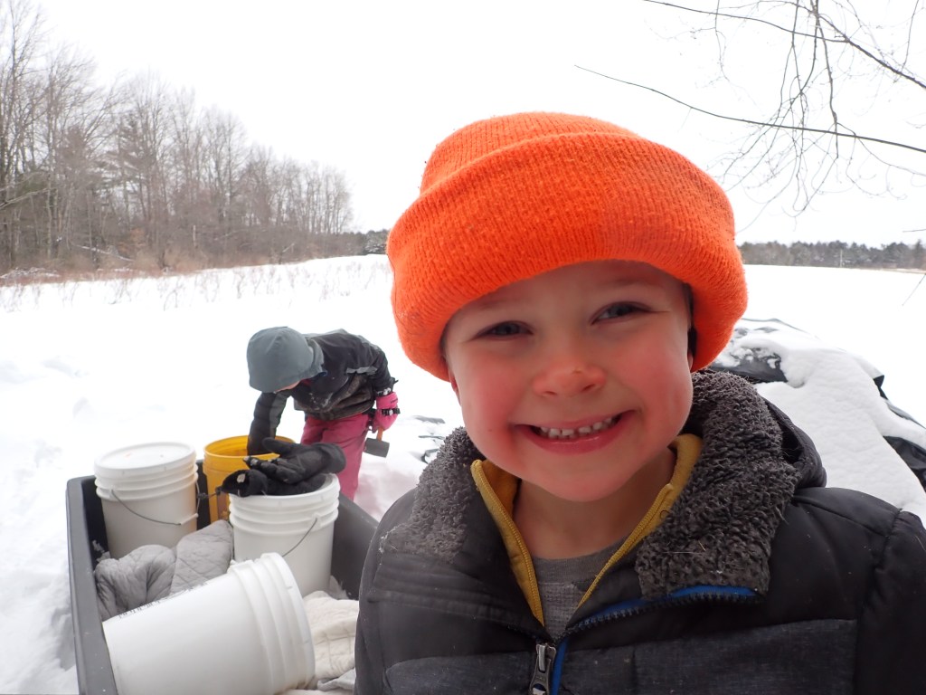 This was taken a couple of days ago. We are out putting taps in a couple of old maple trees. The day before this, everybody’s sap was running. Then this crazy cold snap hit and I just keep walking out to empty snow from sapless buckets.
