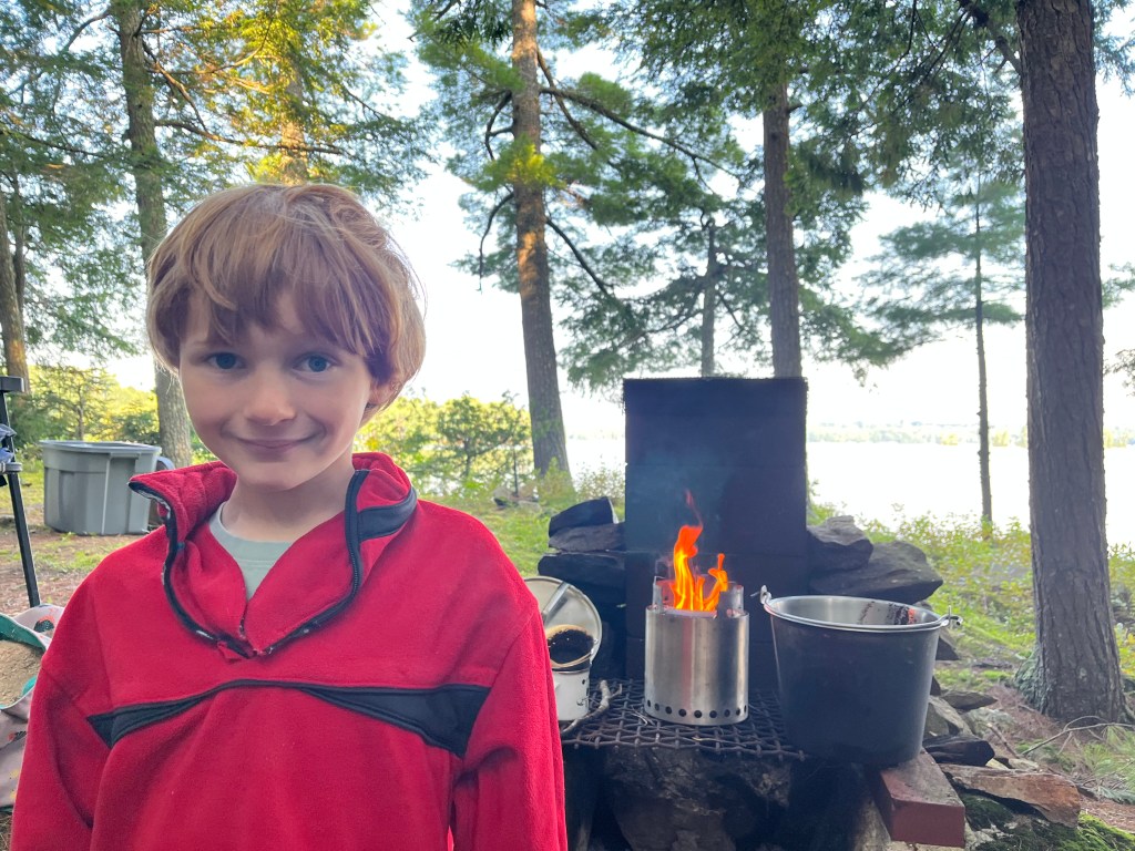 above is Hugo at our camp site in the summer. It was just the 2 of us early in the morning and we are making coffee and hot chocolate over the fire behind him.